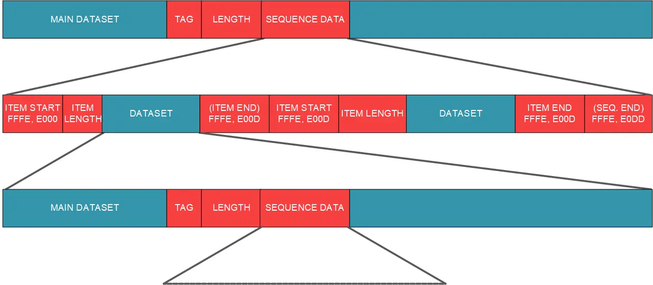 DICOM allows a dataset to contain other nested datasets, which are encoded as “sequences”. The point of this structure is to allow repeating groups of data, so whilst such sequences often only contain a single dataset, the format is defined such that each sequence consists of a set of datasets. Of course, this structure lends itself perfectly to recursion, and some DICOM IODs such a Structured Reporting and the Radiotherapy Extensions can use sequences nested 5 or 6 deep !