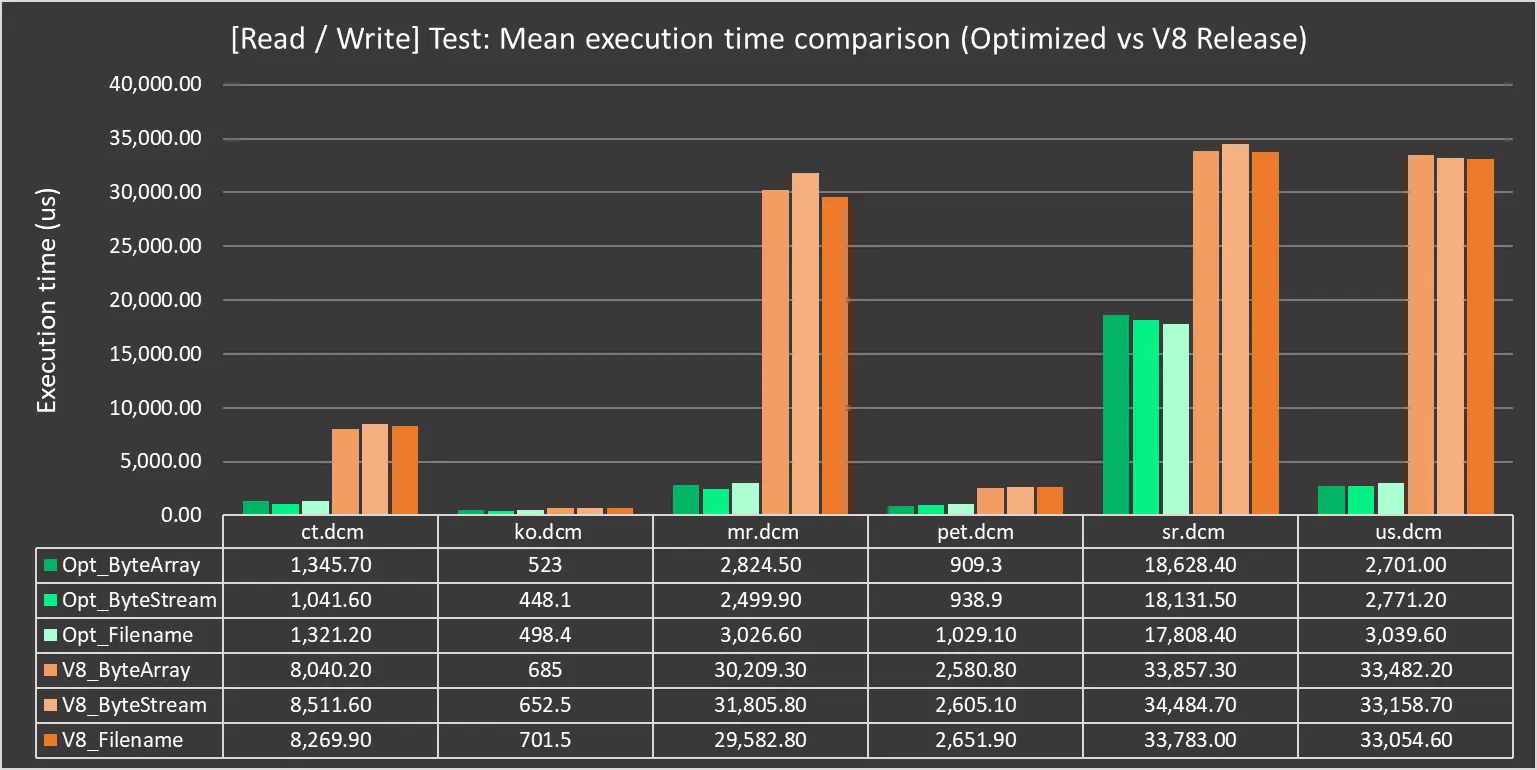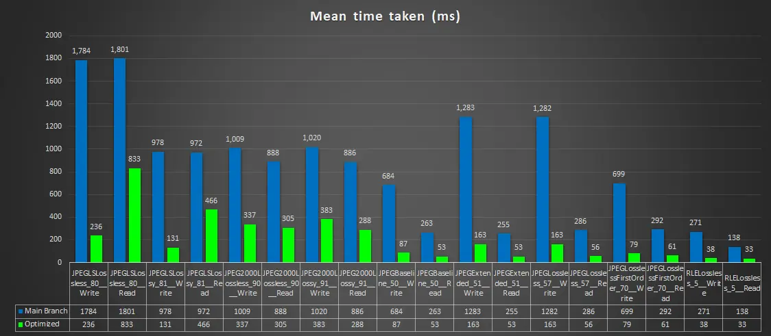 A more comprehensive test would be to read the data, transcode it into another TransferSyntax and then write it out to disk and we are glad to say that is showing massive improvements too: